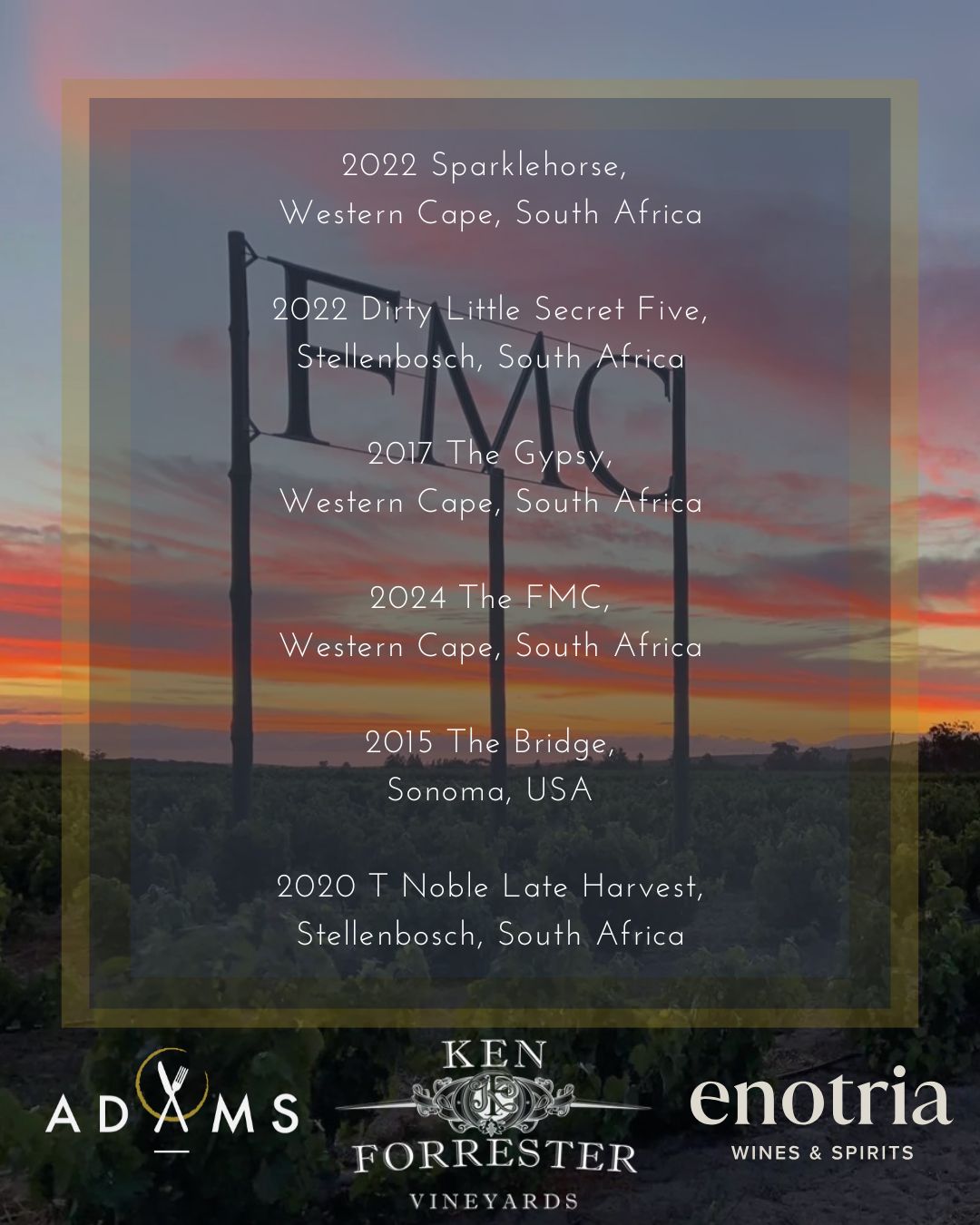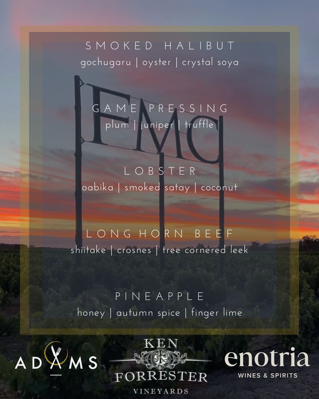 We are delighted to announce our next wine dinner will be held on Wednesday 12th November when we will be showcasing South African wine producer Ken Forrester. We will showcase 5 sumptuous wines paired alongside a bespoke 5 course tasting menu. We’ll start with a glass of Sparkling Cap Classic, followed by a tasting menu with wines finishing with tea/coffee. Water and service are also included for £175 per person. Details of wines can be found here, and menu here .